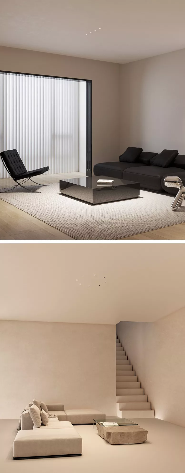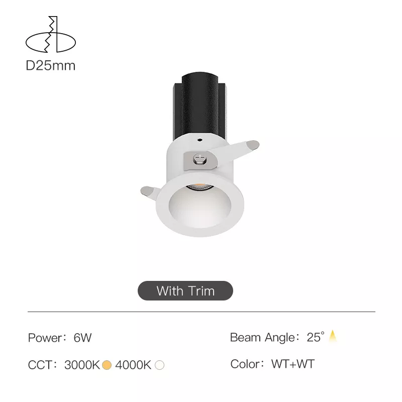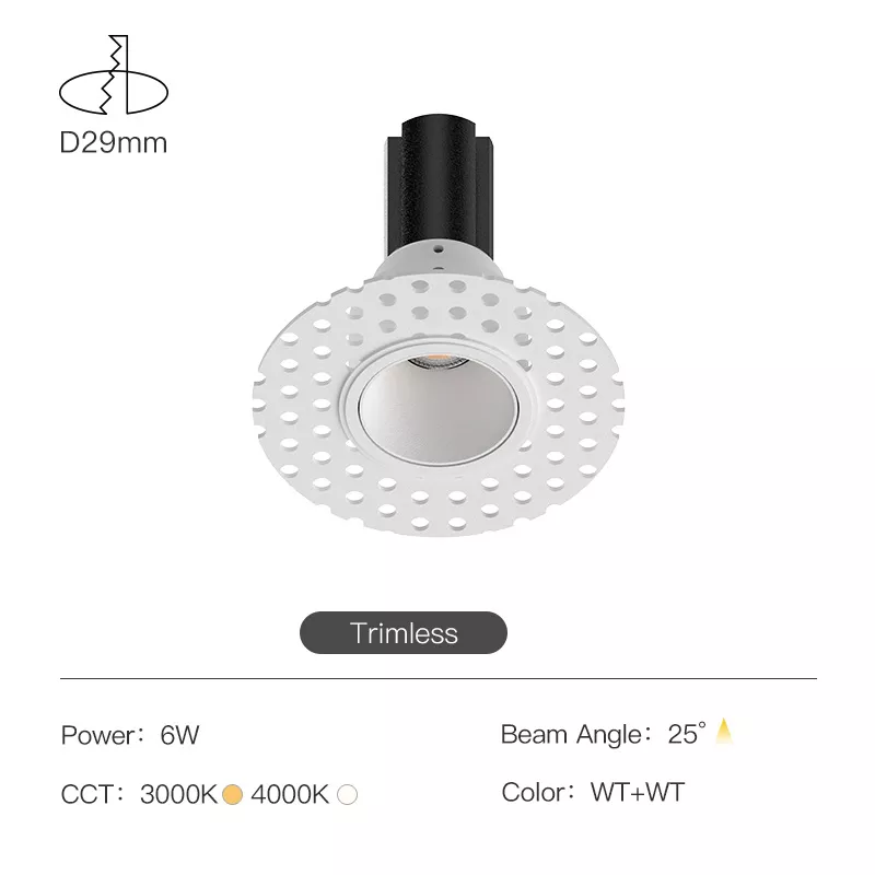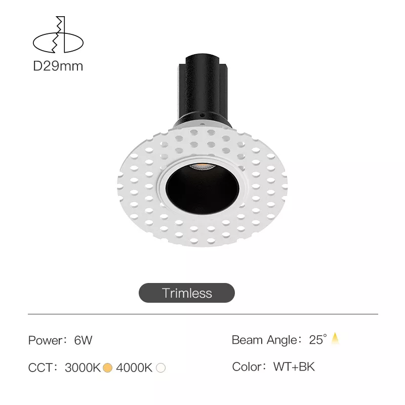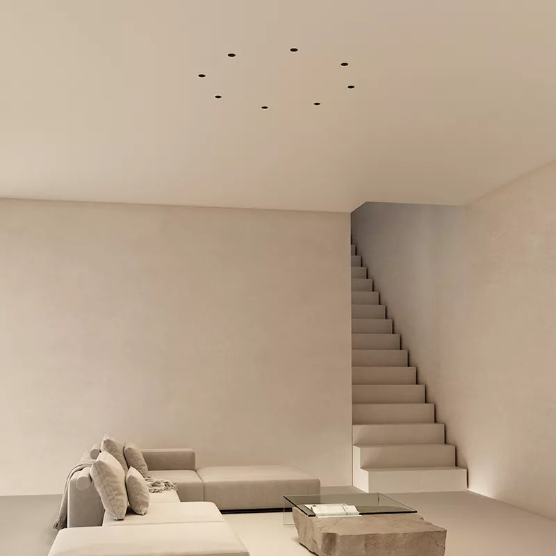 A true 0.5 inch recessed round fixed downlight made for the most minimal ceilings and tightest architectural details. Available in both micro flange and trimless versions, it gives you either a subtle finished edge or a fully seamless plaster-in look with the same internal performance. The ultra-small aperture keeps the ceiling almost invisible, while the fixed beam delivers smooth, predictable light for consistent layouts. Built with a high-CRI LED engine, precision optics for clean cut-off, and a solid aluminum thermal body that keeps output stable over time, it’s ideal for luxury residential corridors, millwork features, boutique retail, galleries, and any interior that needs refined micro-scale lighting.