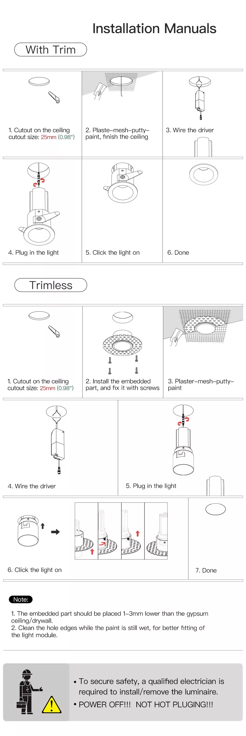This fixture is offered in two ceiling expressions. The micro flange version provides a crisp, minimal border that finishes cleanly against drywall or wood ceilings. The trimless version is made for plaster-in applications, disappearing into the ceiling once mudded and painted. Both versions share the same light engine and optical system, so you get identical beam quality and output. Your choice is purely about the finish style.