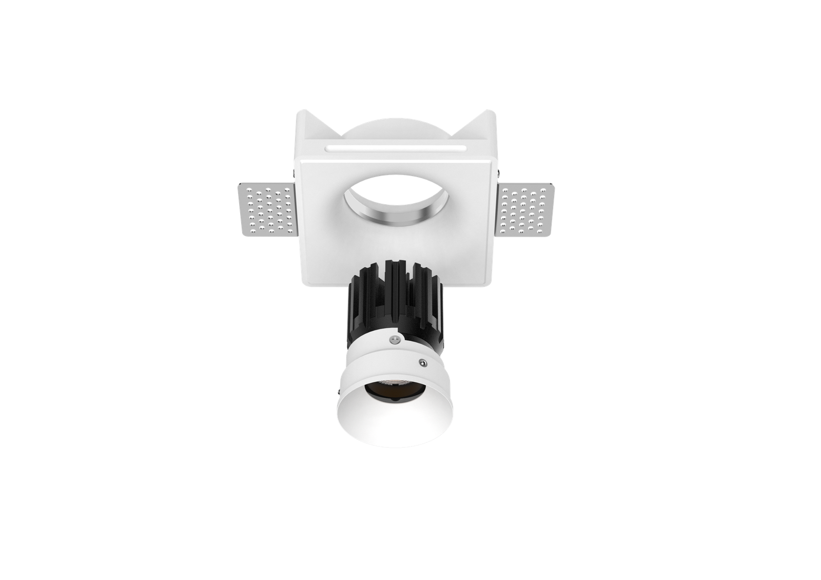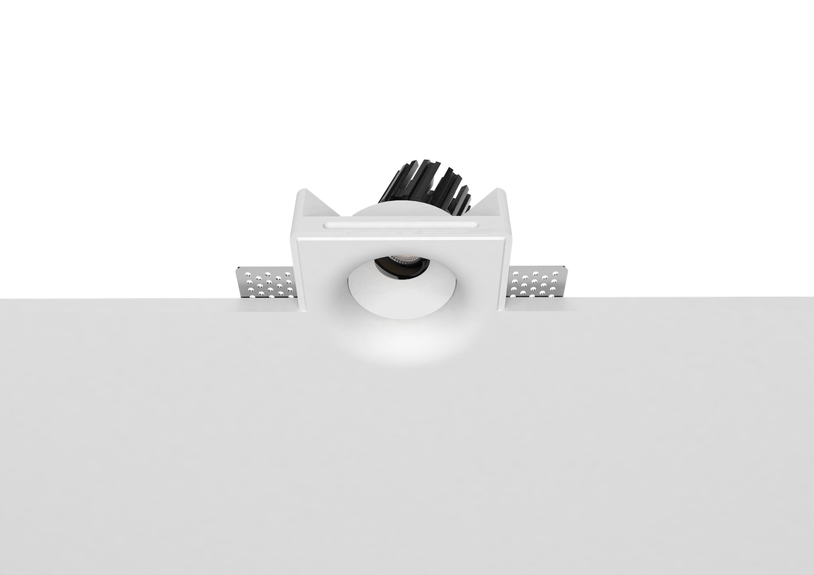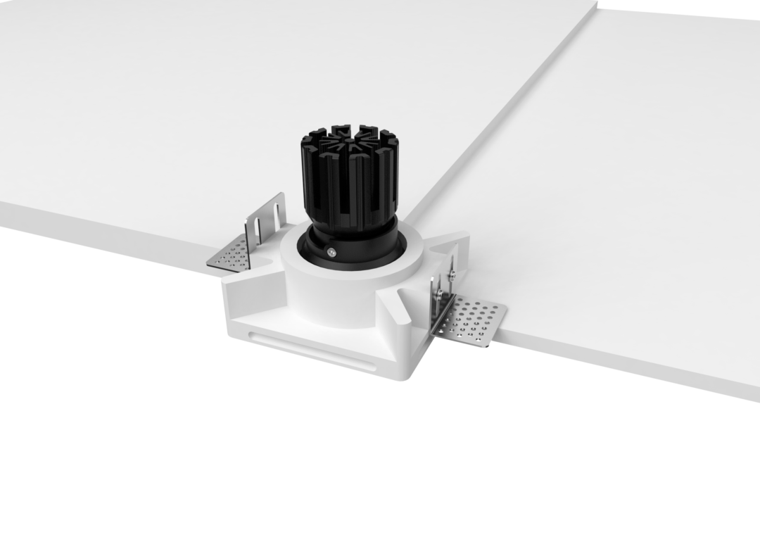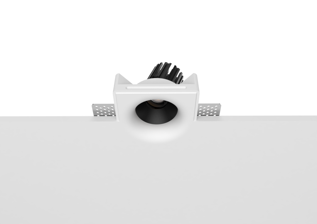 Thermal performance is handled by a cold-forged aluminum heat sink integrated into the lamp body, ensuring stable operation and long-term reliability. The split design allows for easier installation and future maintenance, even after the gypsum housing has been plastered and painted in place.