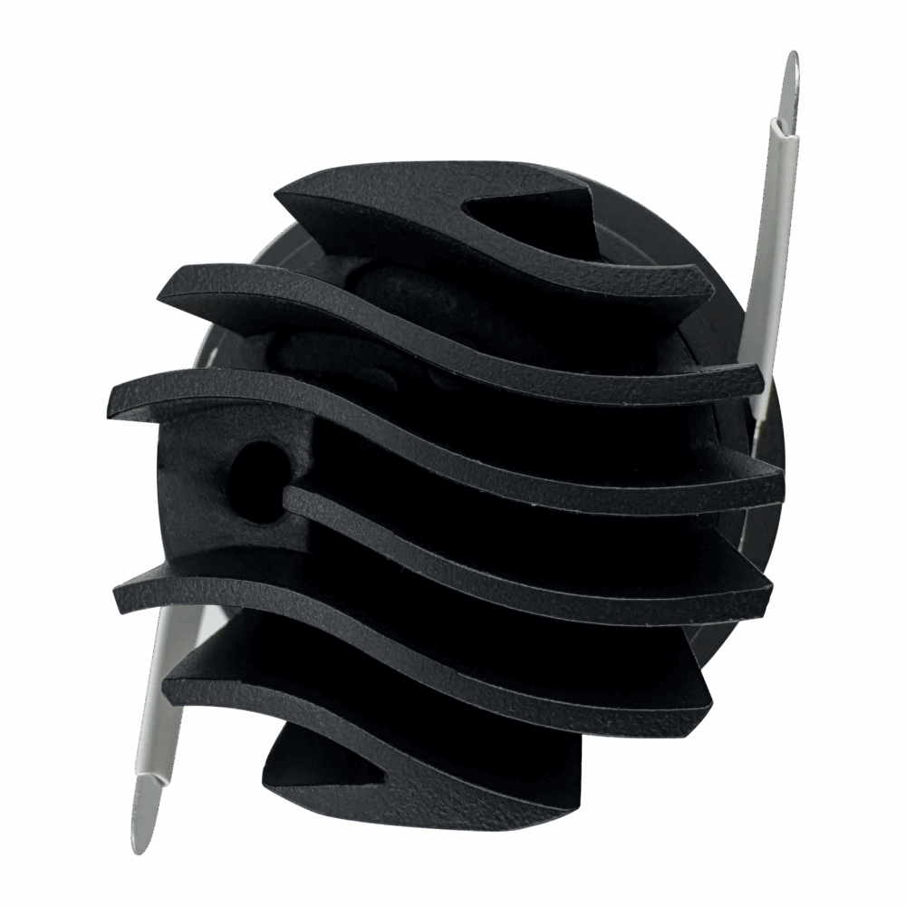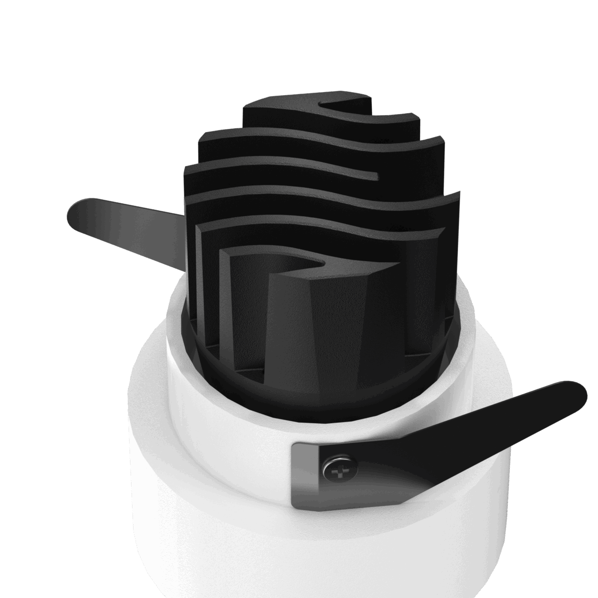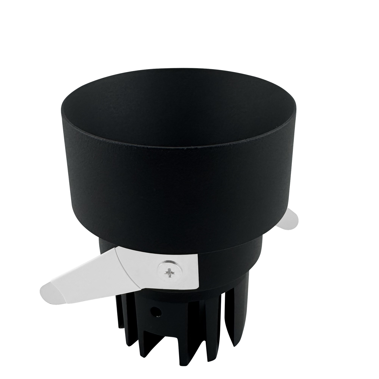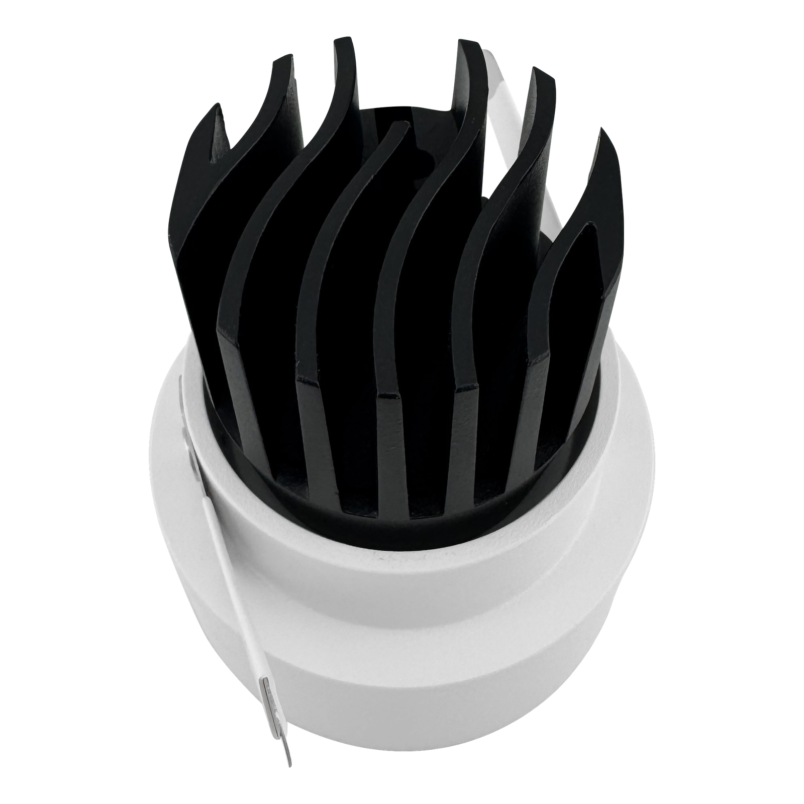 Recessed LED downlight with perforated trim, white bezel, and black aluminum heat sink isolated on transparent background