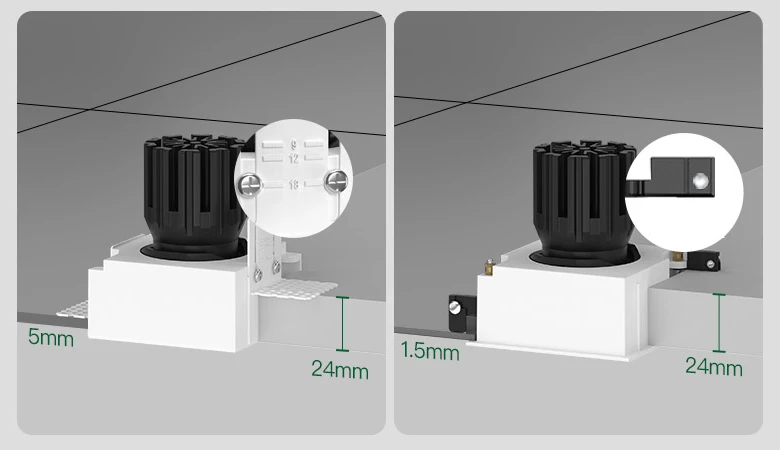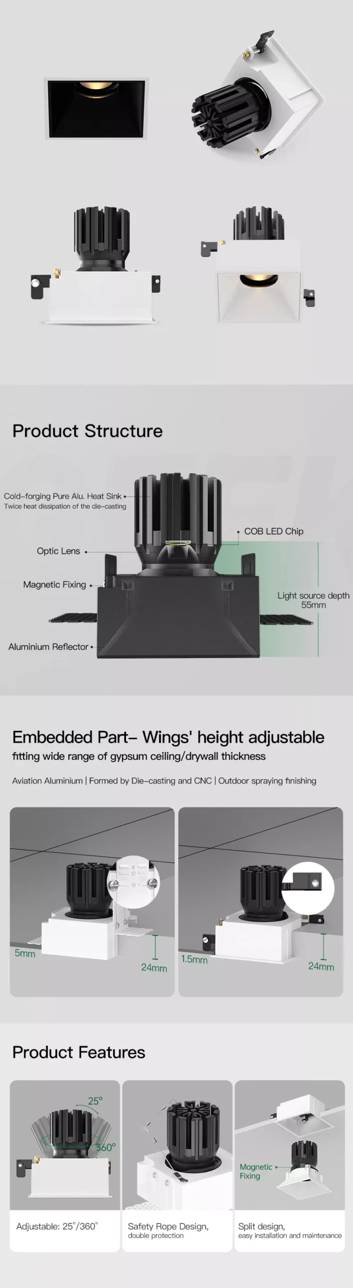 The 3 Inch Recessed Square Adjustable Downlight is made for spaces where the ceiling needs to stay calm, but the lighting still has to do serious directional work. The square trimless profile gives a sharp architectural finish, and the compact 75 mm cutout keeps the fixture visually minimal even in tight layouts.