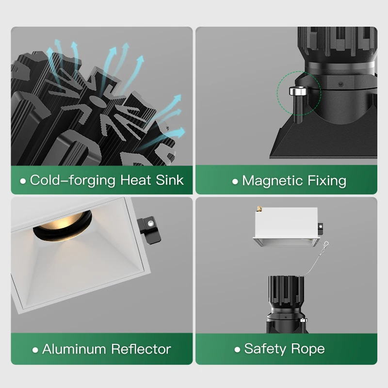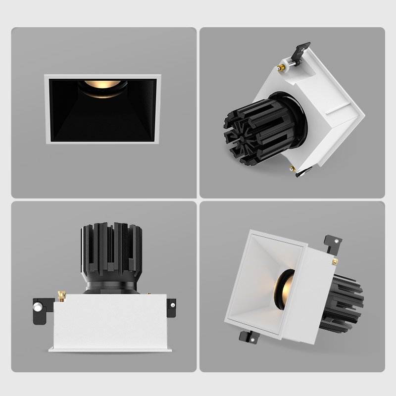 The light engine uses a high-quality COB source paired with precision lenses and a deep reflector. The beam reads clean and controlled, with strong glare shielding so you do not get harsh hotspots or uncomfortable brightness when viewed off-axis. Multiple beam spreads are available, so you can spec tight accent beams or wider general illumination while keeping the same square ceiling language throughout the project.