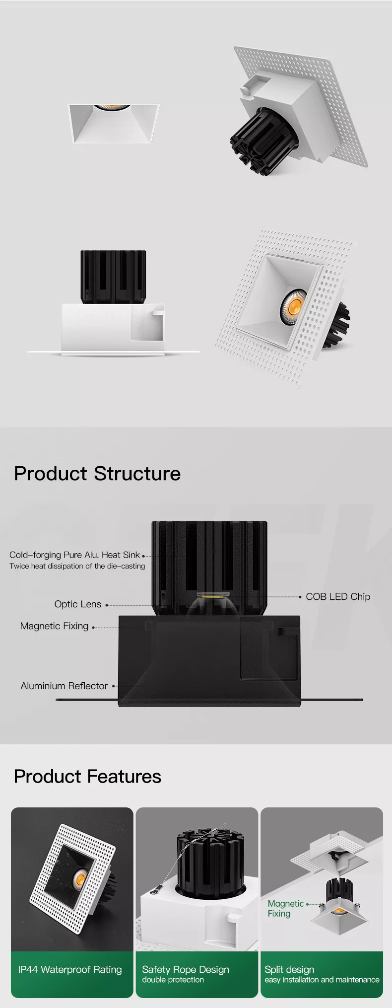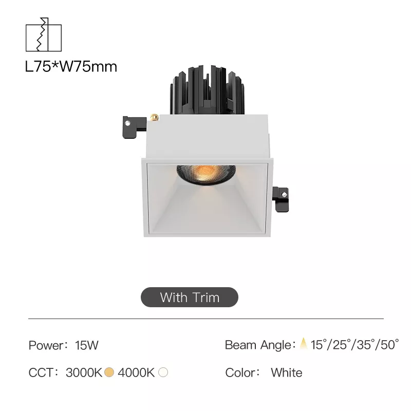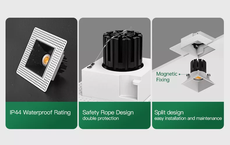 A clean 3 inch recessed square fixed downlight built for moisture-prone interiors that still need a sharp architectural ceiling. The fixed beam delivers consistent, predictable illumination, while the IP44 rating protects against humidity and everyday splashing, making it a dependable choice for bathrooms (outside shower zones), kitchens, spa corridors, and covered soffits. A cold-forged aluminum heat sink keeps the COB LED stable over time, and deep glare-control optics produce a smooth, comfortable beam. Trimless square finish, magnetic trim attachment, and split housing make installation and future servicing fast and tidy.