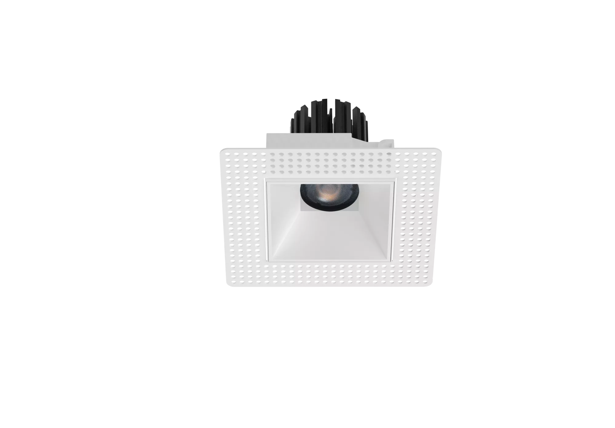 Recessed LED downlight with perforated trim, white bezel, and black aluminum heat sink isolated on transparent background