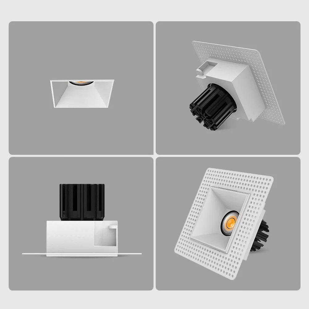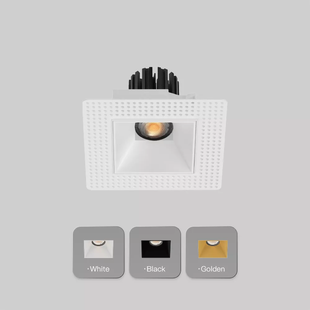 Modern square trimless recessed LED downlight for architectural ceiling lighting in residential or commercial spaces
