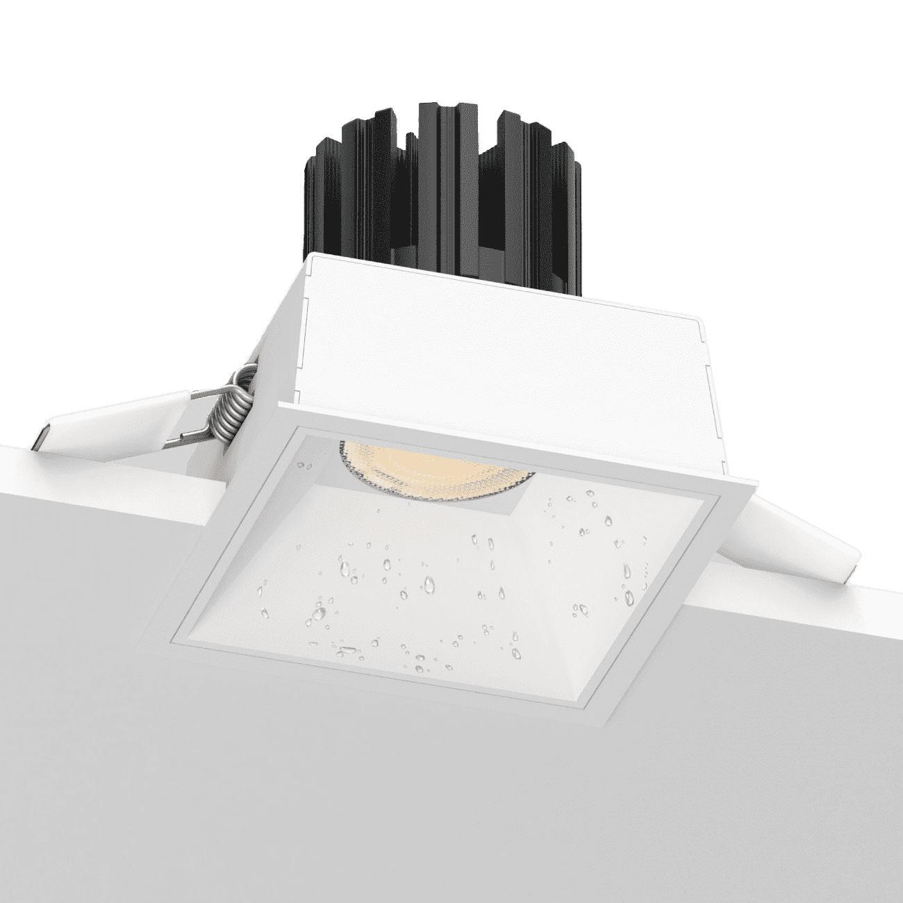 The square trimless profile gives a crisp, modern ceiling look that fits luxury architecture and contemporary exteriors. Because the optic is fixed, the lighting plan stays uniform and predictable, which is especially important in outdoor walkways and wet interiors where even spacing and consistency matter more than adjustable aiming.