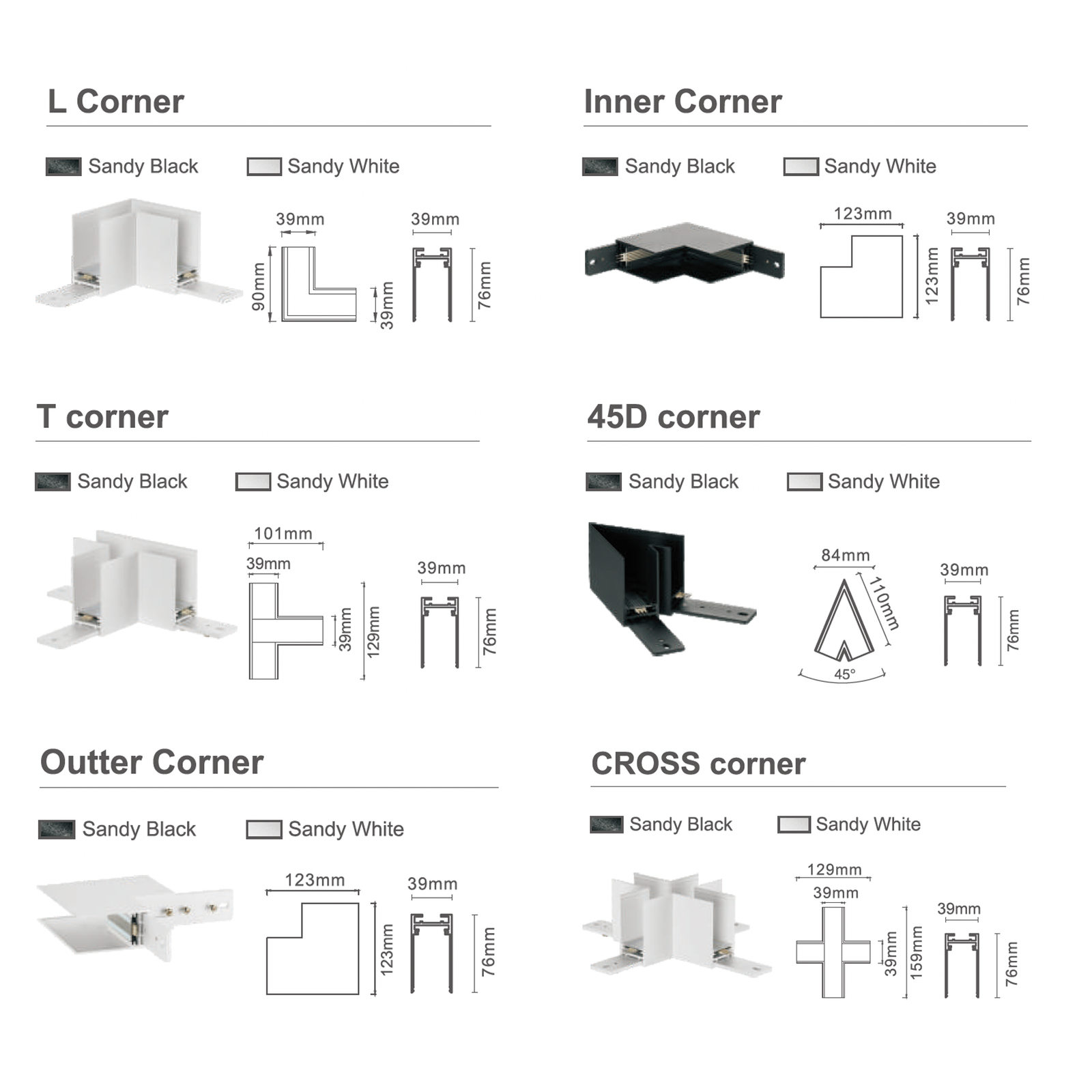 corner connector types for linear lighting system with dimensions and color options