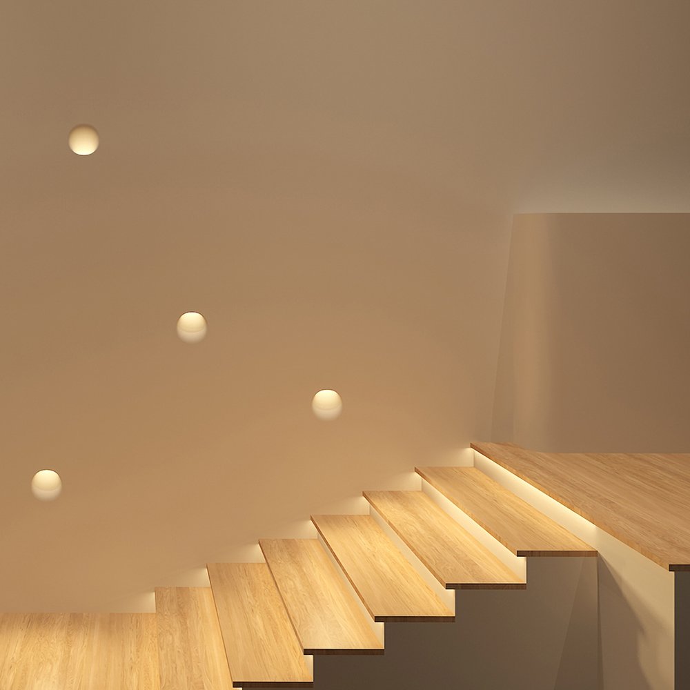 The Trimless Gypsum Circle Step Light is designed for projects where light and architecture are meant to merge into one. Constructed with a plaster-in gypsum housing, this fixture is installed flush with drywall or plaster surfaces and finished on site. Once painted, the body disappears entirely, leaving a subtle circular aperture that emits a calm, directional glow.